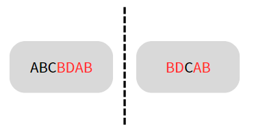 }得到最长公共子序列后,我们就可以在原字符串上将公告序列标识出来,以字符串"ABCBDAB"和字符串"BDCAB"为例: