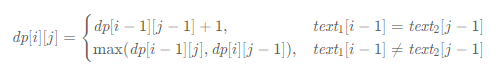 文本1的第i个字符等于文本2的第j个字符,dp[i][j] = dp[i-1][j-1] + 1