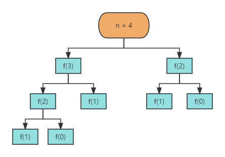 }递归方式代码简洁,但是在计算较大的数列时会有性能问题,因为它会重复计算相同的子问题。比如说n = 4时,递归调用链如下图所示: