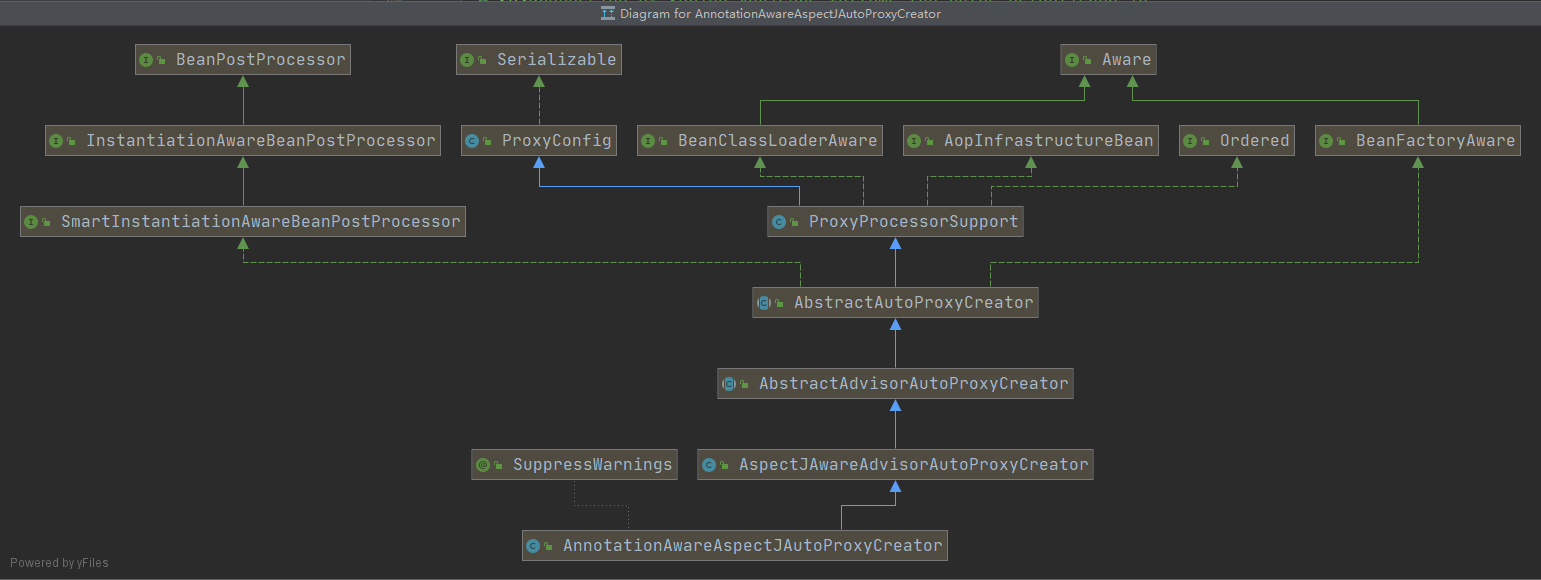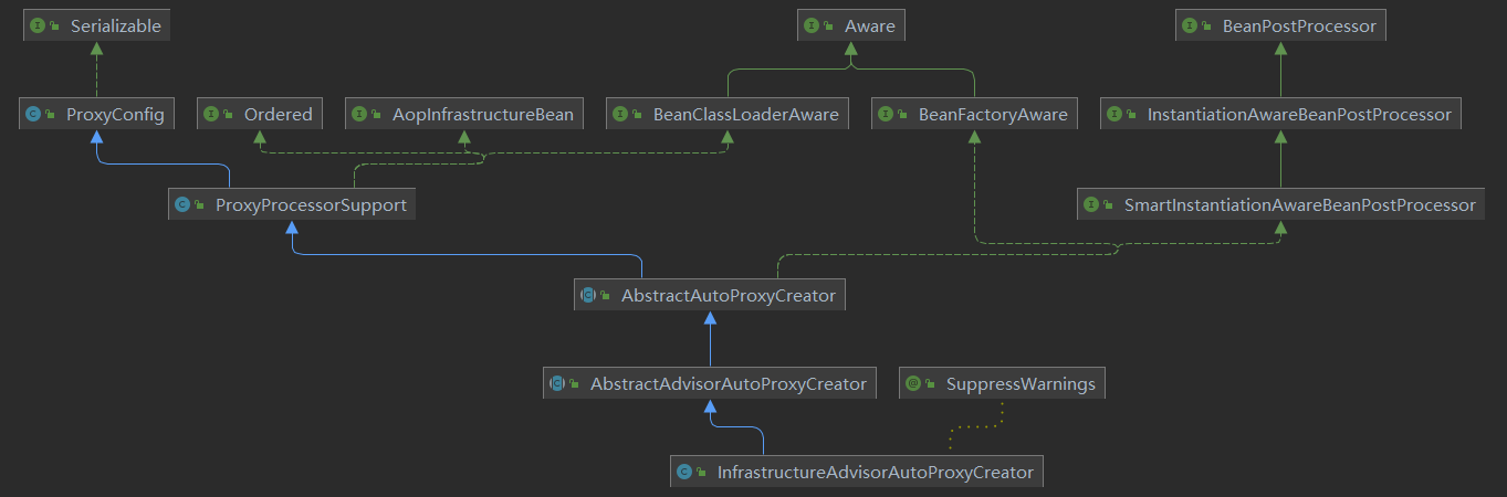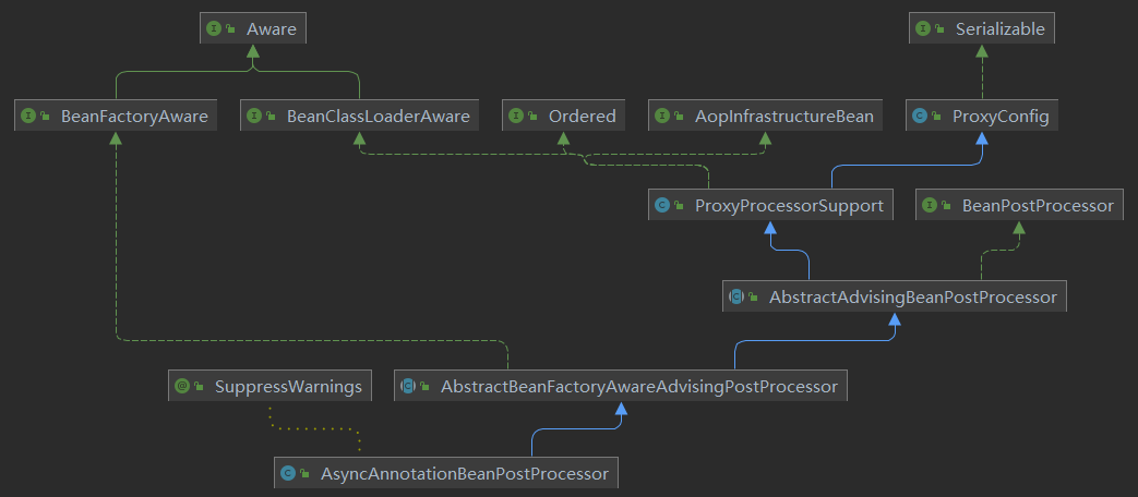 可以看到,确实通过AOP切面@Transactional事务注解来形成的代理对象的BeanPostProcessor都继承了SmartInstantiationAwareBeanPostProcessor接口,而@Async声明的异步执行方法来创建代理对象的BeanPostProcessor没有继承这个接口。所以会出现前面两种代理Bean之间存在循环引用可以正常注入,而后者一旦存在循环依赖,Spring容器就无法正常启动。