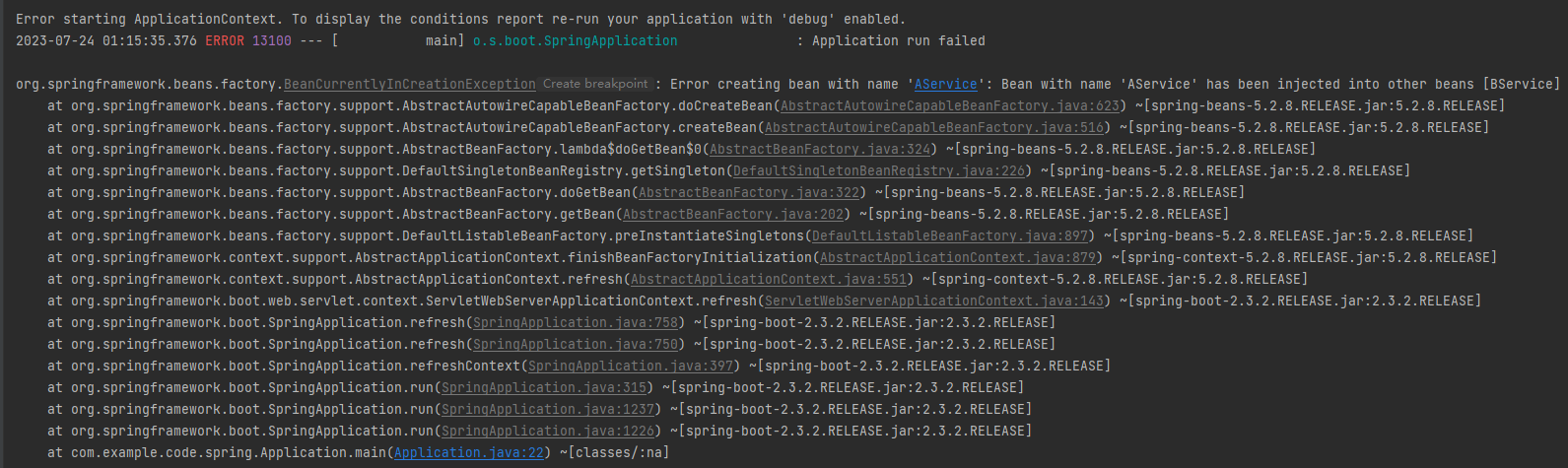 Error creating bean with name 'AService': Bean with name 'AService' has been injected into other beans [BService] in its raw version as part of a circular reference, but has eventually been wrapped. This means that said other beans do not use the final version of the bean. This is often the result of over-eager type matching - consider using 'getBeanNamesForType' with the 'allowEagerInit' flag turned off, for example.